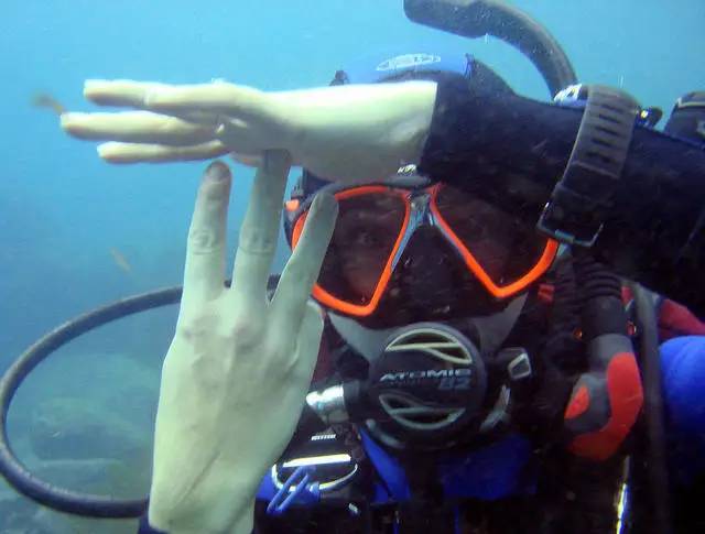 人给要升水的潜伴来个拜拜手势,然后分道扬镳,忘记了那是不顾安全和不尊重潜伴的一种做法。因此,潜伴中如有人示意要升水,不论是为了甚么原因,也应全组人一同终止潜水。这是潜水的法则。