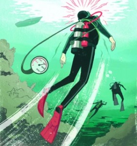 潜水开始了10分钟,一切进行得很顺利。好几个潜水员曾打手势给他,指着他的调节器,他认为他们是在告诉他,他的新调节器在水中看起来很赞,但他不是很确定,所以他只是点点头。他打算潜完回到水面后再问问他们。