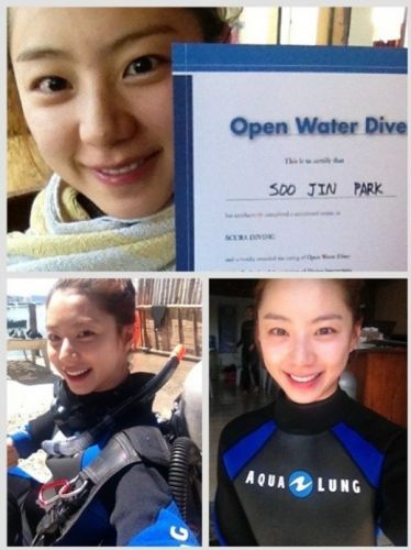 照片中朴秀珍是以英文名字”SOO JIN PARK” 写在这个潜水资格证上, 得到这张证书她笑得很开心. 特别是素颜的她, 看起来还是很漂亮, 引起许多人关注.