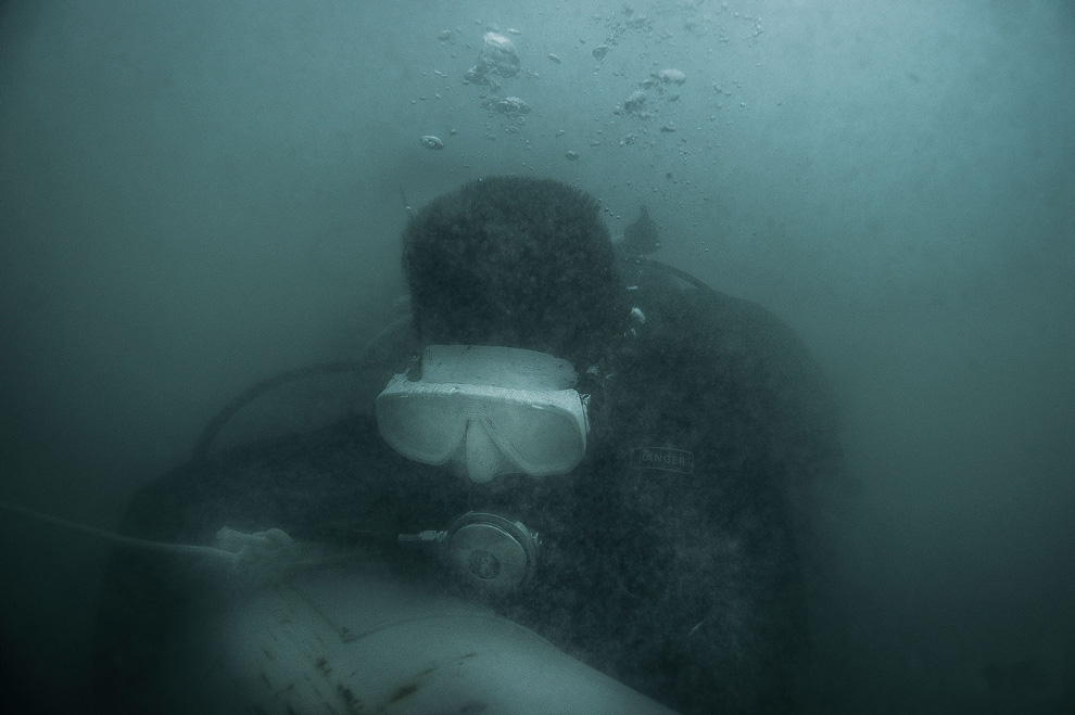 柬埔寨的水下除雷潜水员,图为未爆炸军火的打捞潜水员Leghk,今年33岁,正在柬埔寨西哈努克城的海边参与美国军方第七工程兵潜水分队设计的训练项目。为了模拟将要面临的零可见度的工作环境,接受训练的潜水员要戴上面罩。摄影:hrlesFx撰文:lexKee