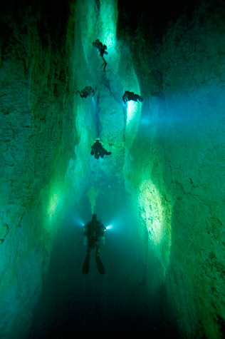 在大巴哈“垃圾坑”里,Kenny Broad蠕动着穿过狭窄的通道,引导绳可以让他安全的返回地面。尽管洋流把垃圾扫到这个洞穴的深处,岩壁生活着各种生命,包括亮红色的苔藓虫;光滑、灰色海绵;带刺的水螅,可以划伤裸露的皮肤。对于许多洞穴潜水员来说,跟Broad一样进入一个以前未探索过的通道,是很神圣的。