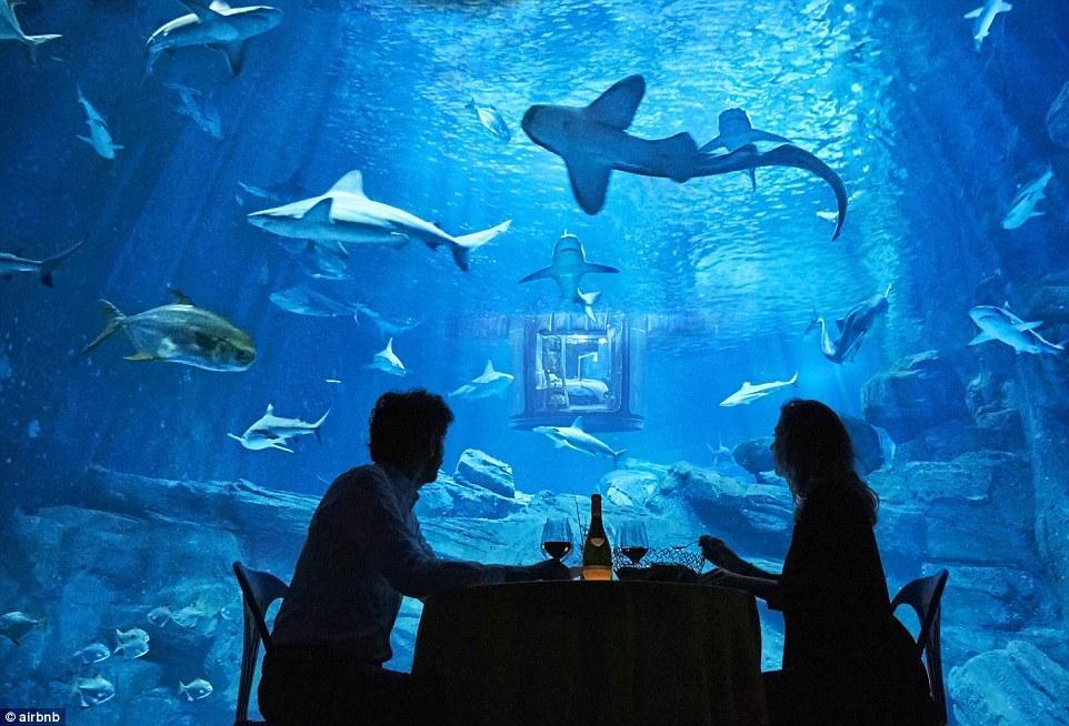 图为游客参观了水族馆以后在水下卧室用餐,同时几十头鲨鱼在他们头顶游弋。