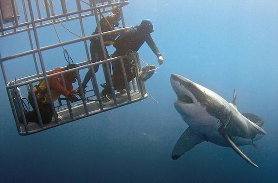 近日,在墨西哥瓜达卢佩圣母岛海岸,一名潜水员通过向大白鲨投喂食物将其引诱至笼子边,将他的手臂伸出,轻轻抚摸了大白鲨的鼻子。这一惊魂时刻被摄影师记录了下来。据悉,大白鲨通常可长达15英尺(约4.6米),重量则可达到5000磅(约2268千克)。2015年11月,曾有一名潜水员游到瓜达卢佩圣母岛海域,与被公认为世界上最大的大白鲨“深蓝”进行了面对面交流。“深蓝”年纪大约50岁左右,2013年开始出现在人们的视线中。摄影师曾公开过“深蓝”与笼子中的潜水员们嬉戏的画面。