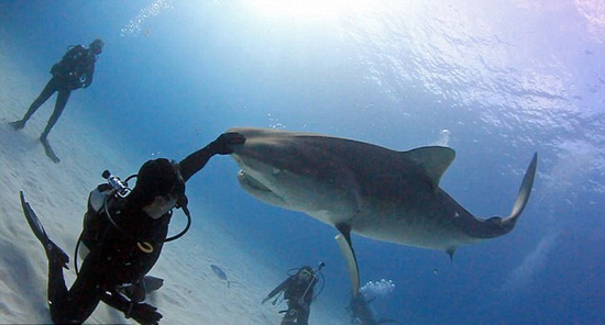 众所周知,鲨鱼食肉成性,凶猛异常,令人避之唯恐不及。近日,美国男子伊莱马丁内斯(Eli Martinez)却丝毫不畏惧,让重达一吨的虎鲨在他的手掌上表演了180度旋体,并称自己是有史以来第一个与鲨鱼共舞的人。