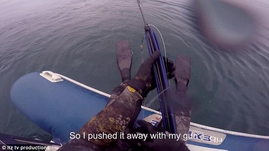 鲨鱼先是加速离开,补料,却又突然掉头朝男子袭来,这名男子不得不再次刺出捕鱼叉,鲨鱼终于游走了。