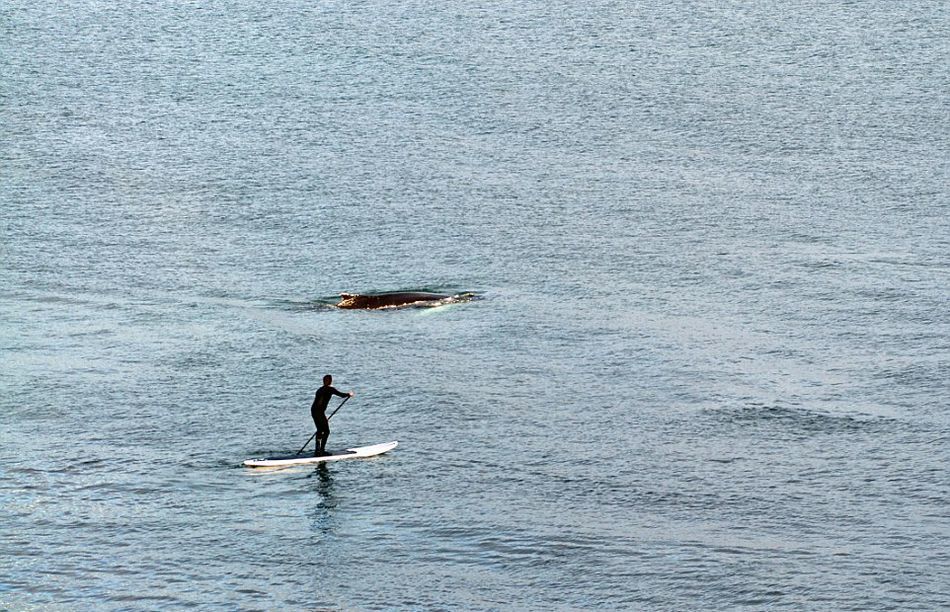 詹森和同伴在海滩冲浪漂移时,一头座头鲸突然在他旁边破水而出。