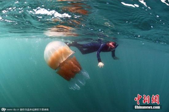 英国西南沿海现大量巨型水母 体长达1.5米,2015年5月24日消息(具体拍摄时间不详),英国,巨型水母现身英国海岸附近,水母体长可达约15米(5英尺),数量达上百只。图片来源:F视觉中国中新网5月25日电据英国媒体报道,英国男子史蒂夫与其孙子费恩日前在西南部沿海潜水时,发现了大量巨型水母,