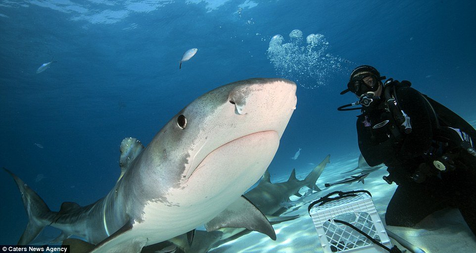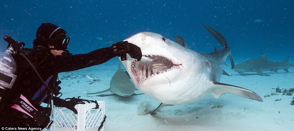 为了吸引虎鲨的注意力以便于他们拍摄更多的照片,摄影师们投掷下各种食物。