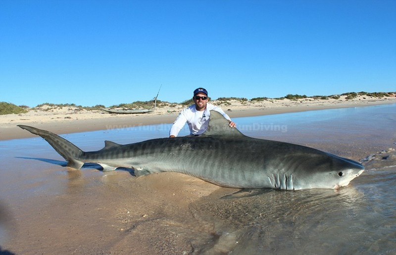 近日,澳大利亚埃斯佩兰斯两名渔民在西澳大利亚北部海岸为期4天的捕鱼行动中,成功捕获10头大型虎鲨,他们钓到鲨鱼后会和鲨鱼合照,再将鲨鱼放回大海。